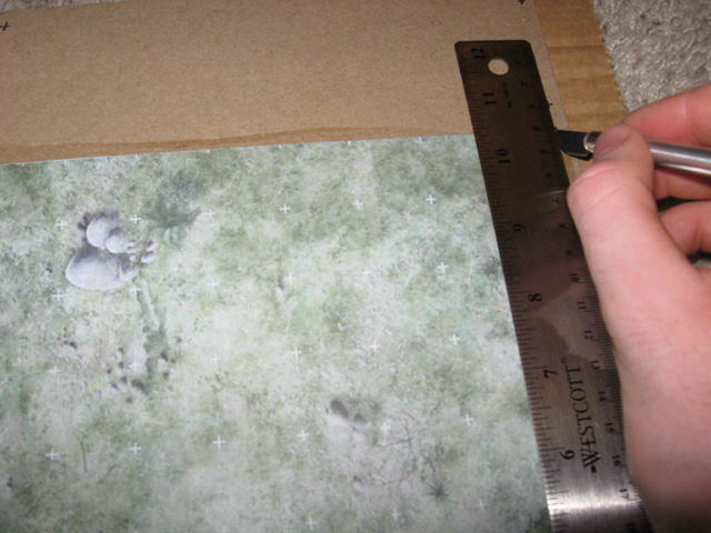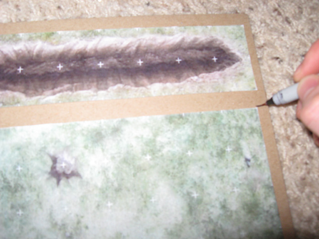 First thing to do is cut out your battlemap and get it pasted onto the chipboard. I make x marks on the chipboard where the corners will be so that I know where to glue.