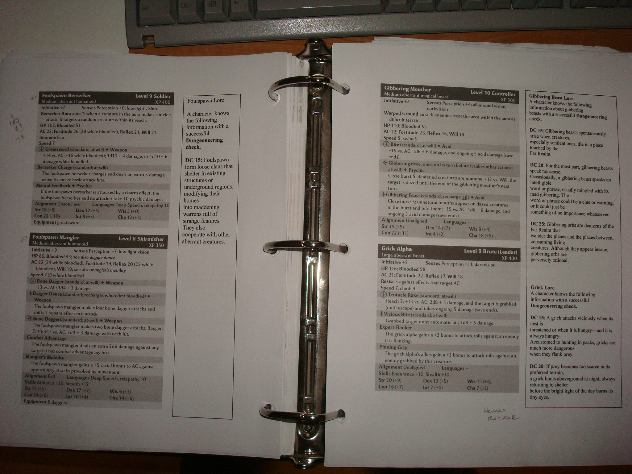 Then finally, I use the DDI compendium, along with my monster manual scans to create the monster sheets with stat blocks. I try to fit them in 2 pages if possible, and punch holes so they face each other on the binder to avoid page flipping. I use the MM for typing out the knowledge checks DC info. This shot uses monster manual stat blocks: