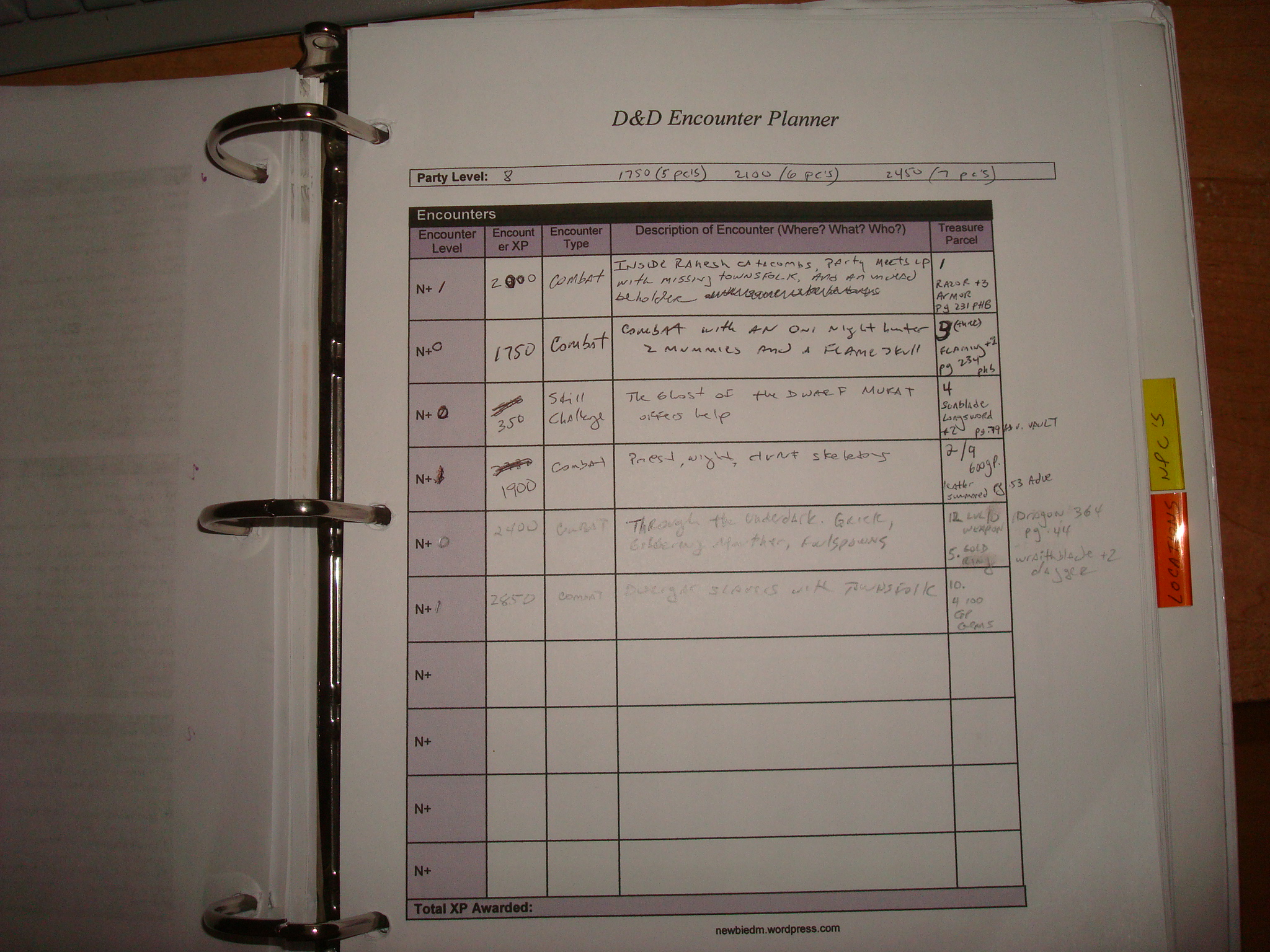 I also have sheets for skill challenges in there as well. As you can see, for me my binder is a necessary utility in my DM’ing. Yours should be on your bookshelf along with your books. Now, as an aside, I’m really glad to be back from vacation. I missed my blog and helping out fellow newbie dm’s, and I hope you enjoyed this article.