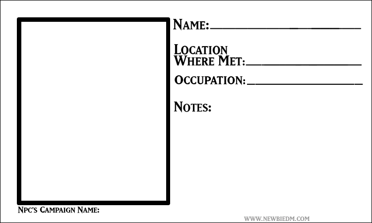 You might also consider an “Allegiance” or “Affiliation” field if you have a game of political intrigue so that the players don’t help the wrong side because they forgot who an NPC worked for, but that might not be necessary in a standard D&D game.