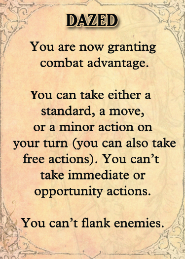 Very nicely done, and I like your previous blog as well about your cool internet finds. I think catdragon’s idea of making positive condition cards, and then laminating the whole set of them is brilliant and would definitely speed up a session. Right now I just have a handout I let float around the table, but I really like the idea of tossing a dazed card over the screen at a player!