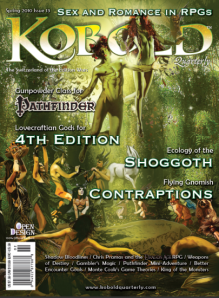 A review copy of Wolfgang Baur’s Kobold Quarterly dropped in the old inbox, and I took it for a spin. First thing worth mentioning is the very randy and very sexy cover by Malcolm McClinton, it was worth a double take, and I’m sure it’s there to complement the article on sex and romance in your fantasy rpg game.