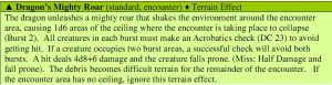Talking D&D on twitter the other day (hmm, I write that a lot, don’t I?) I was discussing with Mike from the Sly Flourish blog and Quinn Murphy from the “At-Will” blog about how D&D is very focused on using the terrain and environment in interesting ways, so how about making solos interact better with it? Quinn told me about how he’s designed some of that as skill challenges, but I’m thinking about adding an entirely new section to some solo’s stat blocks, that reflects the way the monster can interact with the environment in the encounter area. Imagine if you will, a dragon’s roar. Beside shattering the ear drums of your PC’s, imagine how cinematic would it be if the dragon roars so loudly that it literally causes the ceiling in the surrounding environment to fall around the players, creating all sorts of cinematic mayhem.
