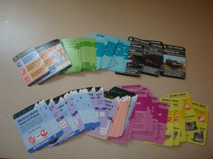 So the game is played by arranging a set of cards called the timeline on the table. These are 24 double sided cards, 4 rows of 6, with one of the cards actually being part of a special stack made up of 5 cards. The players are handed an ID card, telling them who they are playing, and what their goal is in order to win. Each player has a goal, and that goal is to make sure that on the timeline, 3 specific things happen in order to ensure that character’s survival. The trick is that one player’s goals may not necessarily be beneficial to another player, so the game becomes a competition between players to constantly change the timeline around to their benefit.