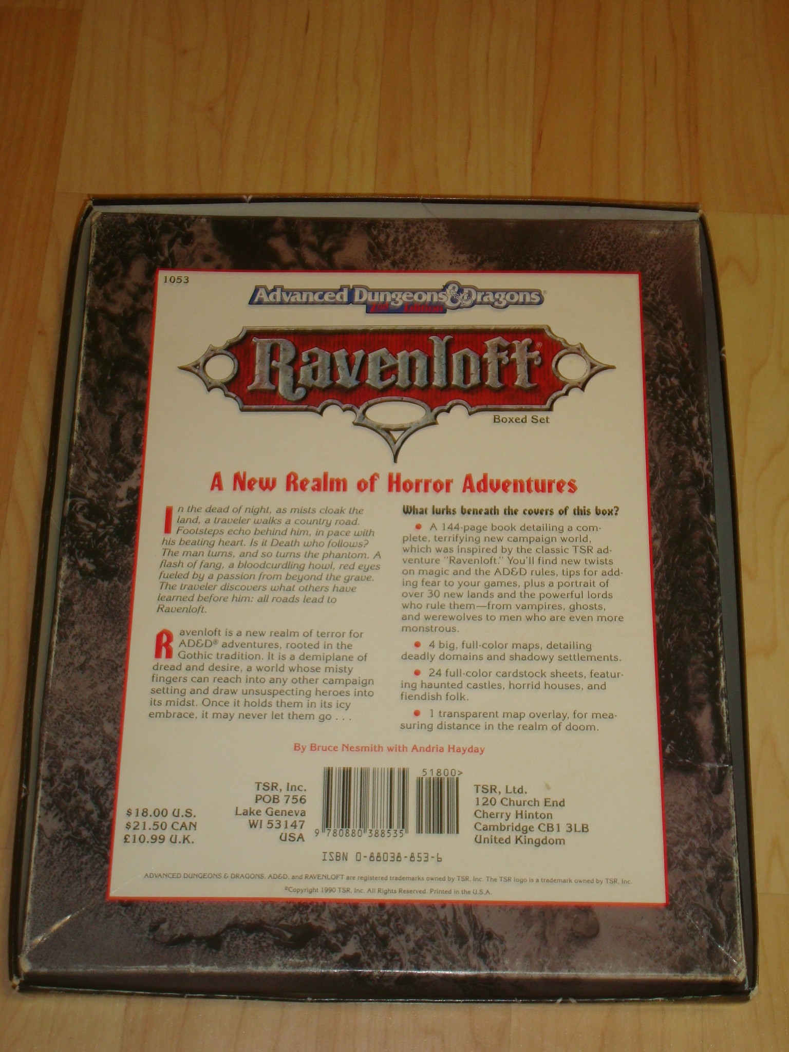 So there you go, that’s what’s inside the “Ravenloft: Realm of Terror” black box for the 2nd Ed. AD&D game. In 1990, the box had a price tag of $18.00. Today, you can pick it up on Ebay for more or less the same price, if not cheaper.