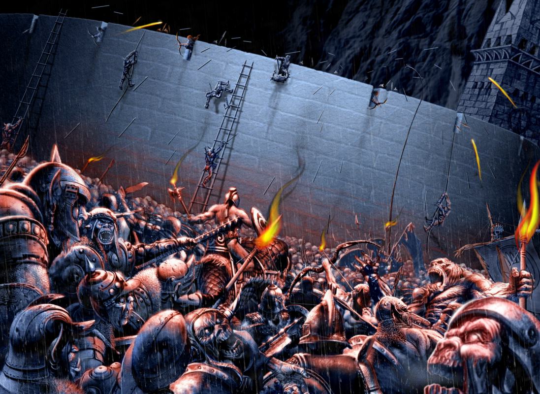 Phase two began about twenty minutes after the first phase ended. I felt generous and decided that the PC’s would have a chance to regroup and bring themselves back up to full hitpoints to face the coming assault. And a dangerous assault it was. The encounter called for the players to have to kill 12 darkspawn (3 x no. of PC’s) before they could move on to the next phase. The darkspawn came over the wall at a rate of 1d6 every two rounds. The players had the option of toppling ladders with a strength test (TN 13), leading to the autimatic death of the darkspawn on the ladder. As you could probably tell, it’s a tough encounter with the possibility of the party quickly facing tough odds.