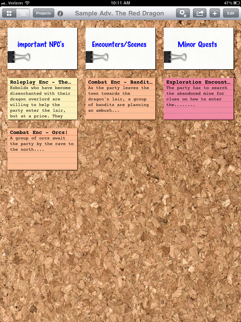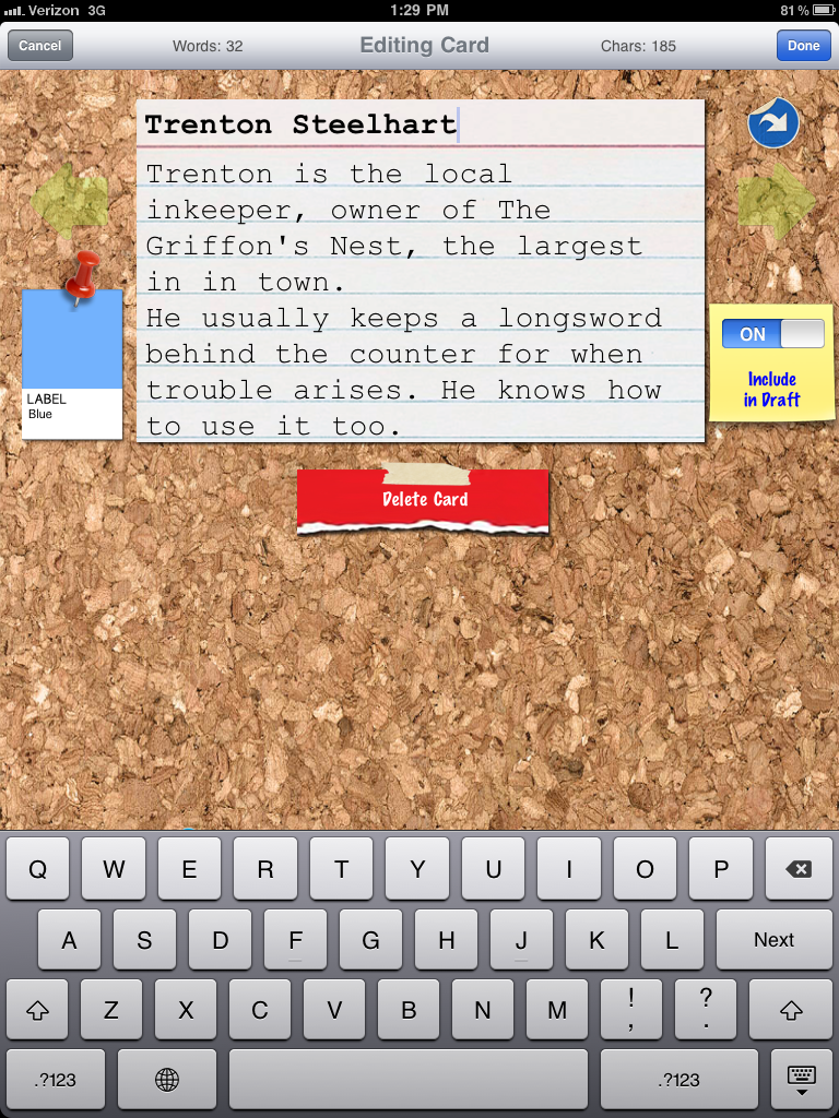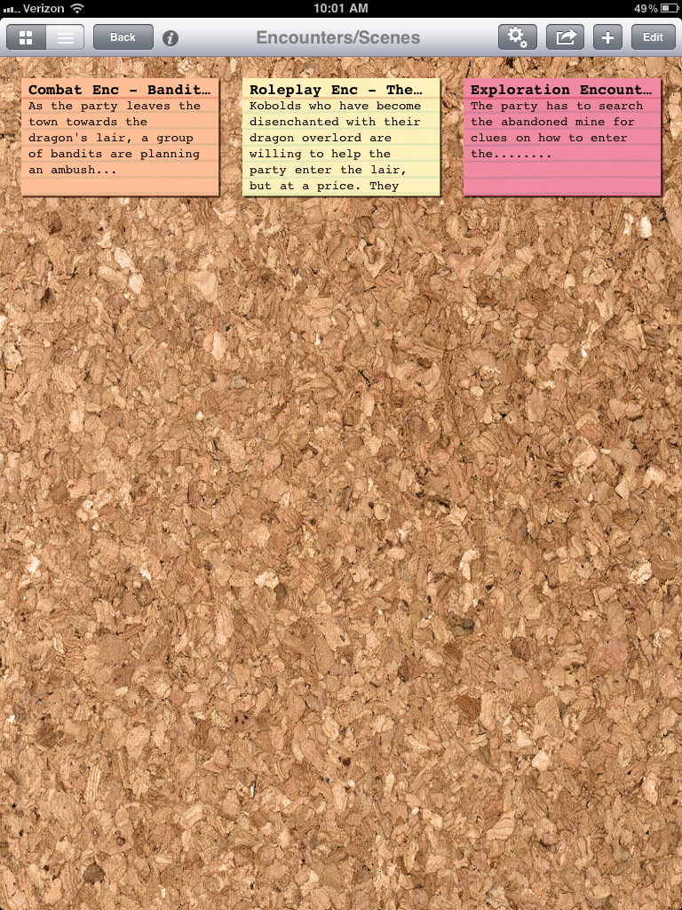 I don’t have an iPad, but I am very interested in getting one for reading PDF rulebooks. I’ve seen the index card app many times because of its interoperation with Scrivener, the writing program. I use it for managing my campaigns, and it has an index card view among others.