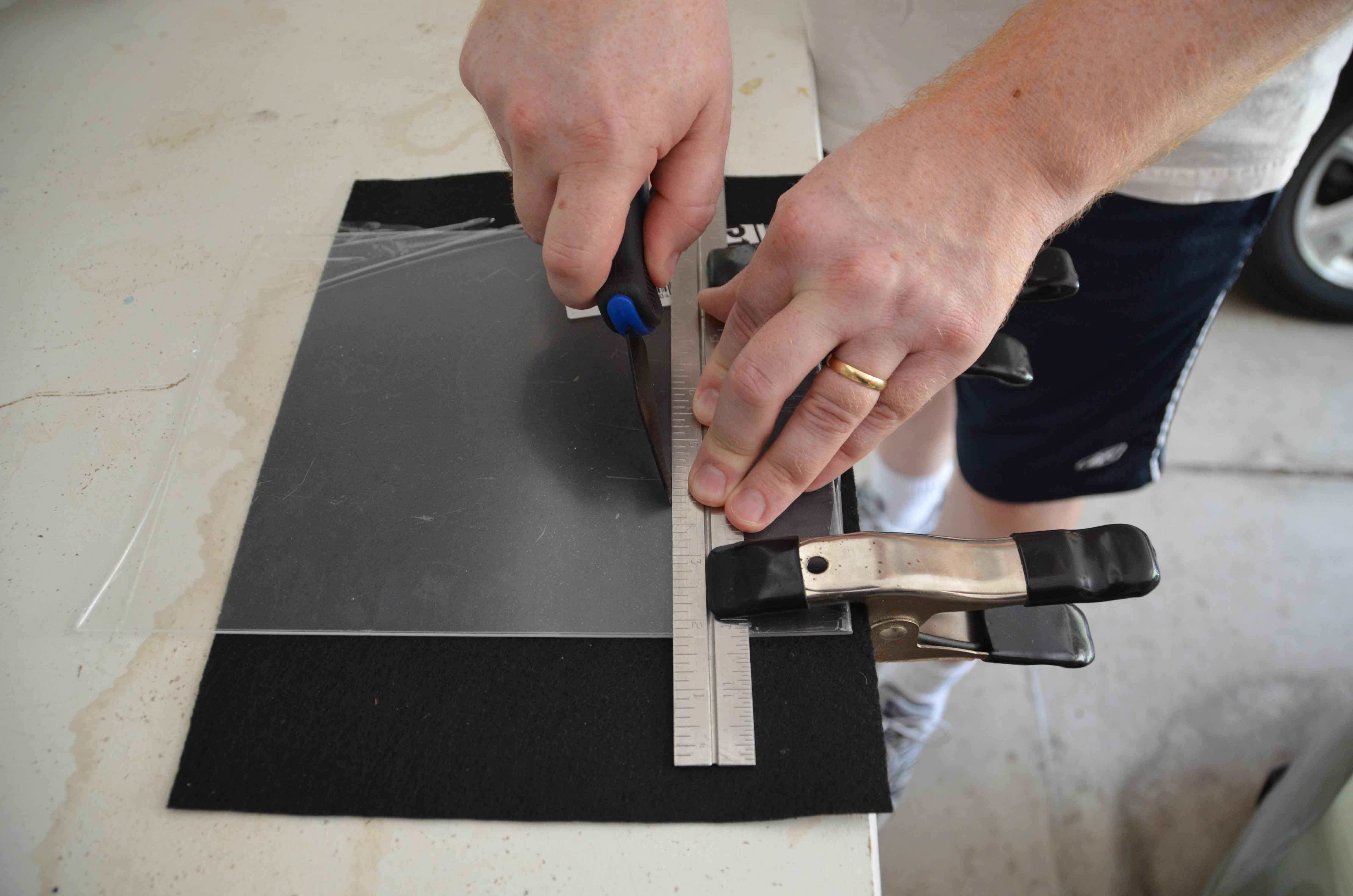 Once you’ve got the dimensions determined, you will want to score the acrylic with your plexiglass cutter. You will need to hold the acrylic down very firmly. I actually used some small clamps to hold it in place, because I found it difficult to do