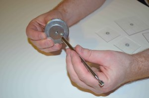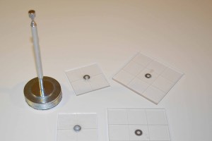 On the same side of the platform as you added the grid lines, we will now be gluing the small #6 washer to the center of the platform. Once the platform is finished, this washer serves as the mechanism for attaching the platform to the magnetic tip of the telescoping pick-up tool on the ACS base.