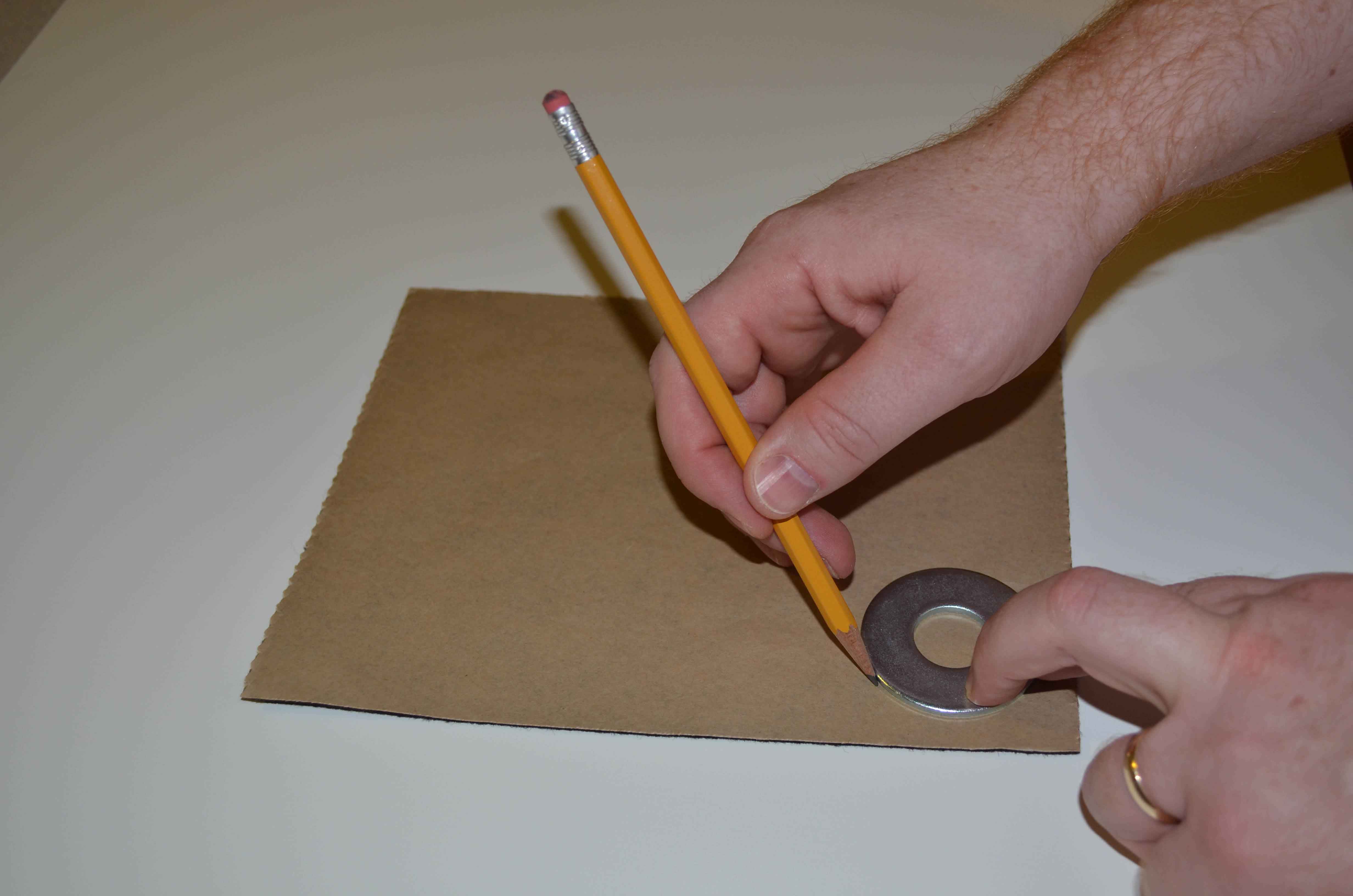 Flip the felt over so that the paper backing is facing up. Place one of the 3/4″ cut washers on the felt, and trace an outline around it with a pencil. With a sharp pair of scissors, cut the felt along the lines you traced. You will want to cut the inner circle of the washer out as well. Once you are done, the piece of felt you cut out will look like the letter “O” (or a flat donut). Set this aside. You will need it in Step #3. Do NOT peel off the felt adhesive backing, yet.