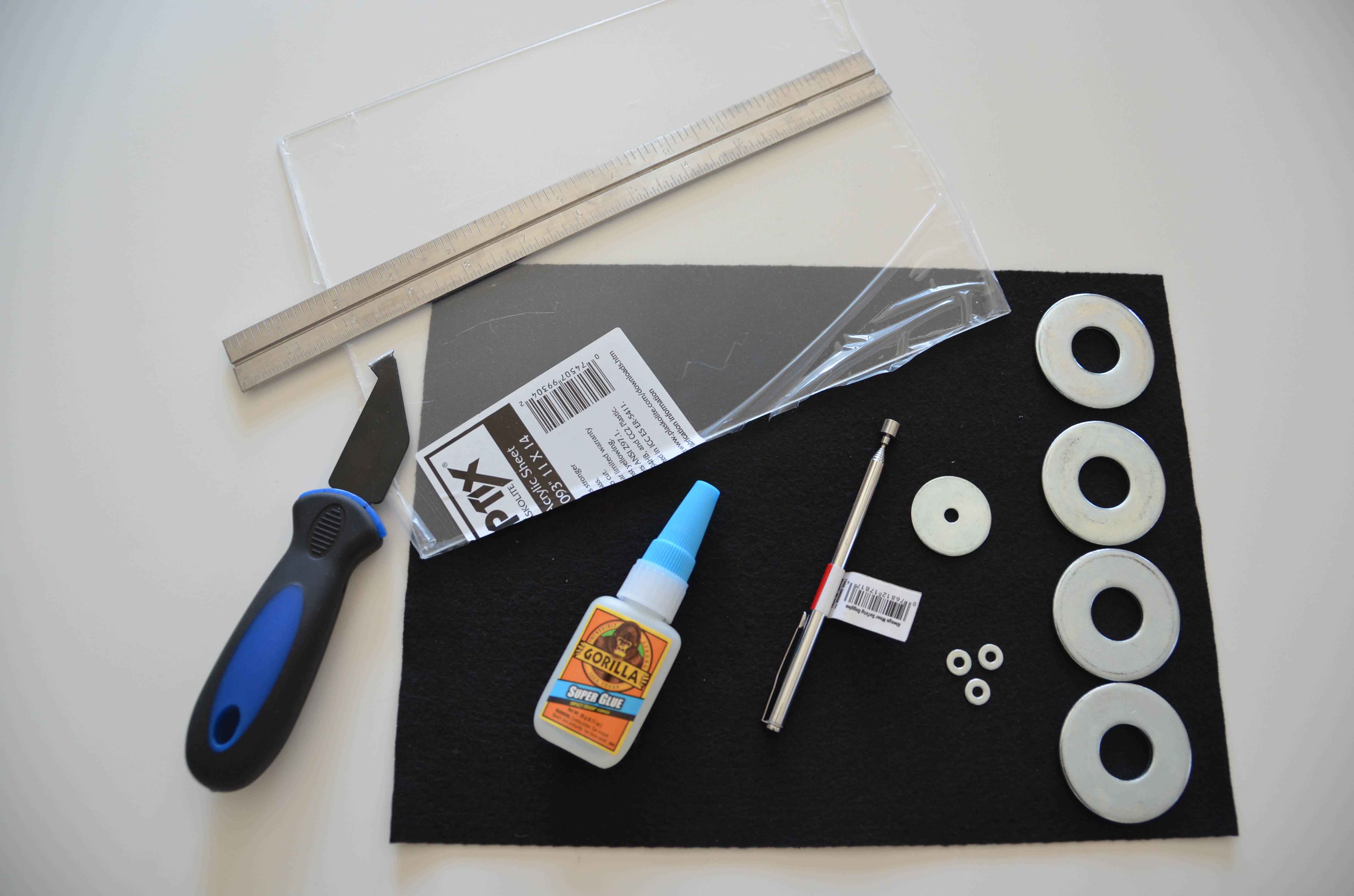 When gluing the washers onto the acrylic, you will want to use a little extra care to avoid using too much glue. I’ve found that some super glues cause a slight discoloration of the acrylic, and if you accidentally get some glue on other areas of the acrylic then it won’t look quite as nice.