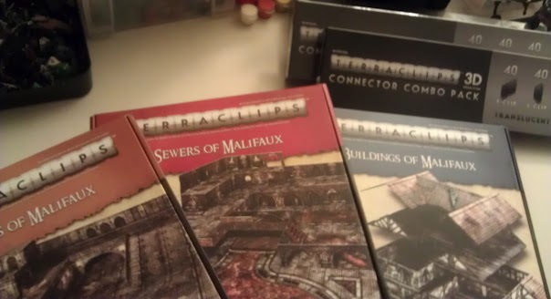 I dropped most of my GenCon budget on the streets + buildings + 2xterraclips last August, and then hit The Container Store for storage. These are gorgeous, and as a DM who’s used battlemaps since AD&D, absolutely no buyer’s remorse! Using Dungeon Tiles is tricky – they are thicker and don’t fit easily into the clips. The Malifaux tiles are limited to a few sizes: 3×2 and 6×2 walls, 3×3 and 6×6 floors, unlike DTs, so layouts are a bit less flexible. Check out my website for a few more pics of the tiles in action – I built the warehouse map from ‘The Temple Between’ Scales Of War adventure http://www.wizards.com/DnD/Article.aspx?x=dnd/duadp/20081210