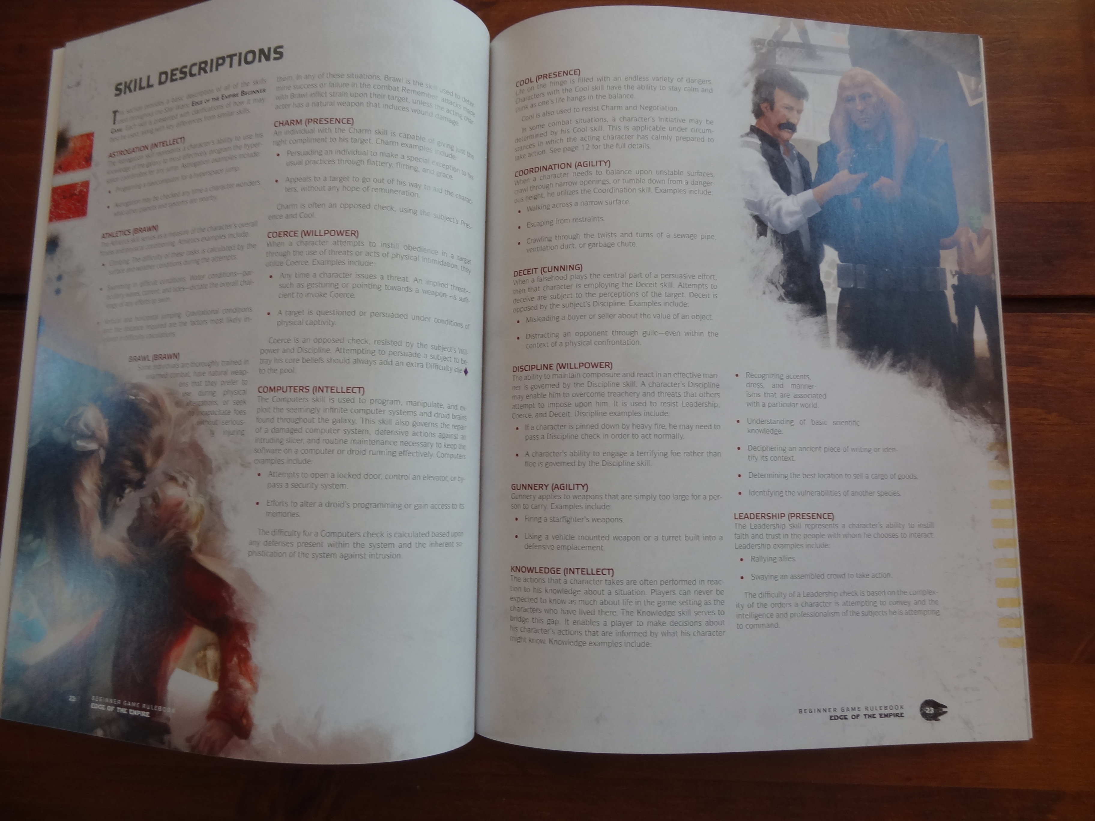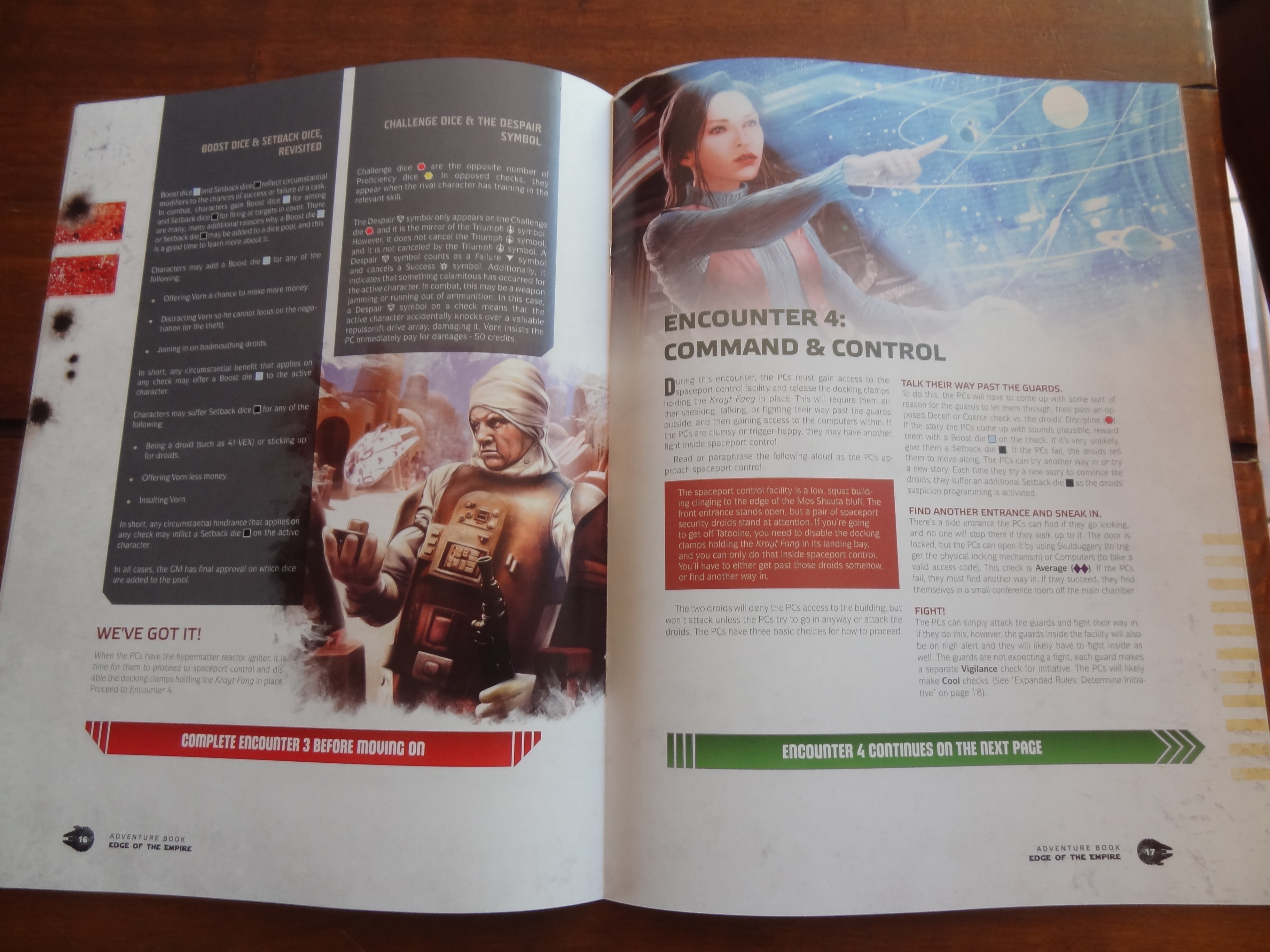 The books are softcover, but the rule book has a stronger backing than the adventure book. The paper is glossy, and of high quality. There is new artwork, and gorgeous one at that, throughout the game. They didn’t just lift art from Lucasfilm, they commissioned artwork. One thing that I don’t like is the box itself. It’s a flimsy box with a flap opening, and an insert to hold it in place. It is not a sturdy box by any means.