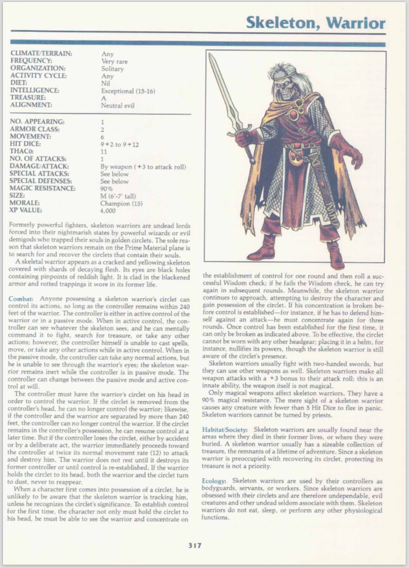 The following monsters are a pair of undead, the Skeleton Warrior, and the Huecuva. The skeleton warrior was a nasty monster back in the AD&D days of yore. (It also made for a memorable character in a classic episode of the D&D cartoon). It first appeared in the Fiend Folio for 1e, then reappeared in the Dragonlance Monstrous Compendium appendix, and eventually ended its AD&D appearances in 1993’s 2e Monstrous Compendium. Almost a bit lich-like, the skeleton warrior has an interesting backstory… its soul was trapped long ago in a circlet by powerful demigod or an evil wizard. Their only raison d’etre is to search for and find the circlet containing their souls. The circlet can be used to fully control the skeleton warrior, but if the circlet gets lost watch out… because the skeleton warrior will stop at nothing to kill its former controller.