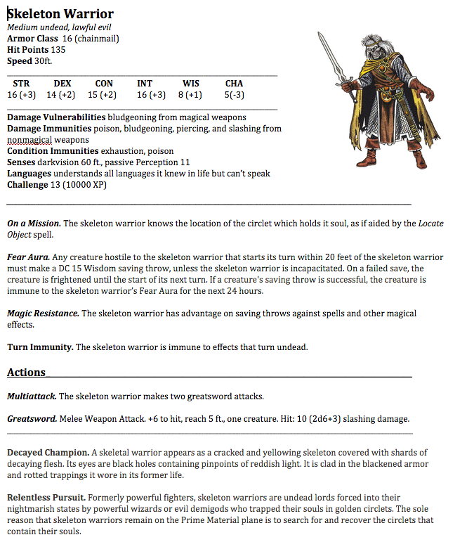 Thank you for sharing your creations. The skeleton warrior is one of the creatures included in Fifth Edition Foes so it’s interesting to compare the results. They decided to give it lair actions too.