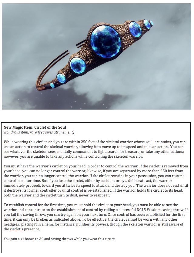 Granted, it’s a very situational type monster. But I thought it was a neat backstory. Neat enough that I wanted to see it in 5e. In 2e term, it was a 9+2 to 9+12 HD creature. In 5e I made it a Challenge 13 monster, since the guy is loaded with immunities and can’t even be turned. He’s a nasty critter. Now, one of the things not described in the AD&D version is the magic item which makes up this monster’s story. So I added it to my write up. It’s basically a golden circlet that grants a +1 to AC and saving throws, along with the skeleton controlling abilities.
