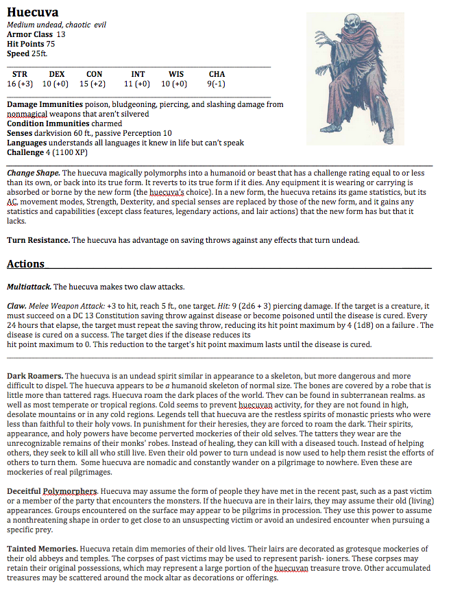 The final monster is a neat one, and a bit of a D&D trivia oddity. The huecuva, or heucuva, depending what you’re reading. You see, it’s one of the few D&D monsters (maybe the only one) that managed to have an editorial error slip through the cracks and become canon. In the Fiend Folio, it was huecuva, and later it became a heucuva due to a typo. The rest is history ( and you can read more about this on page 6 of Dragon Magazine issue 168).